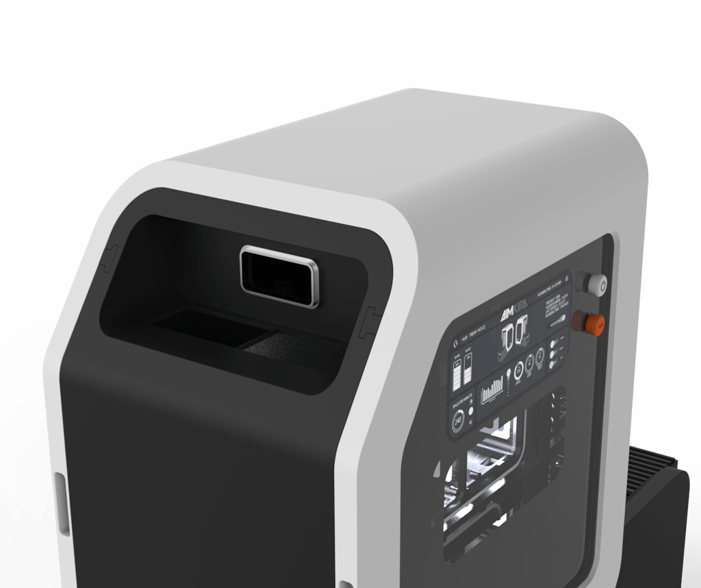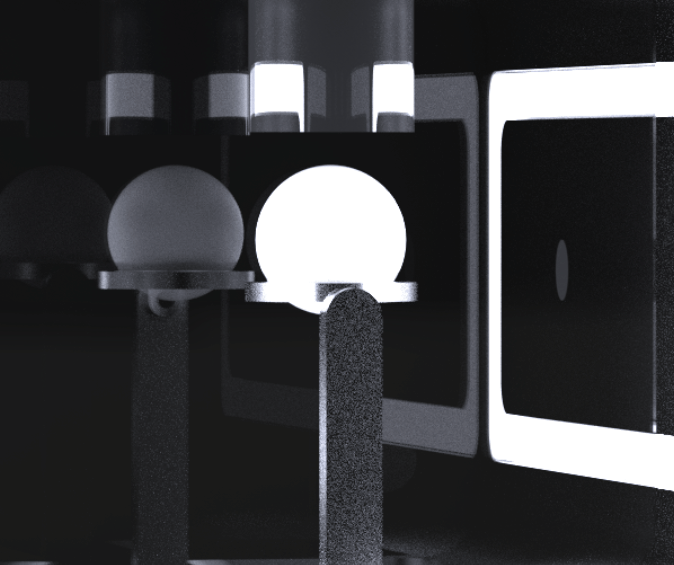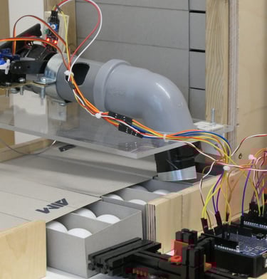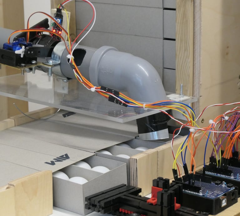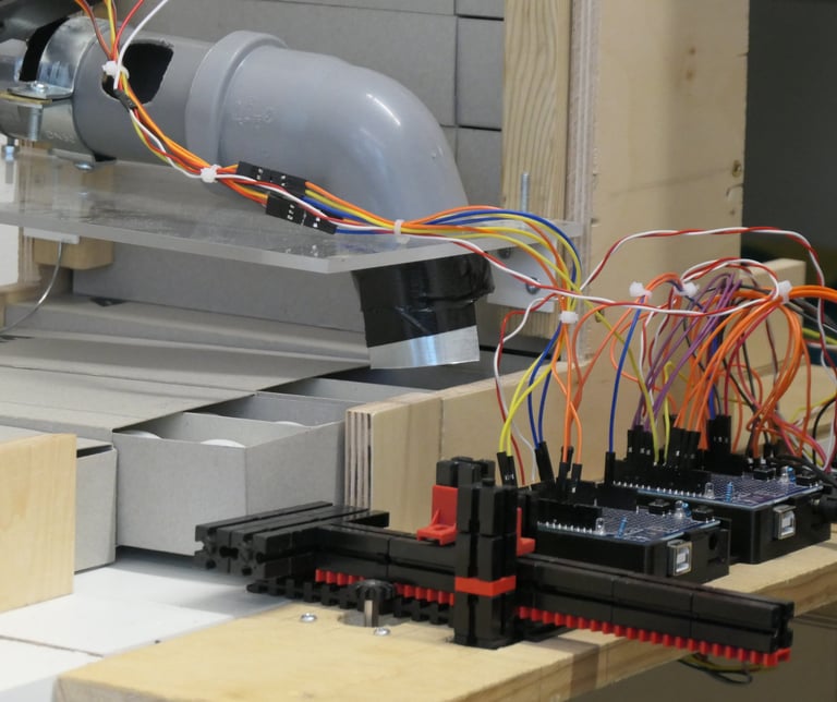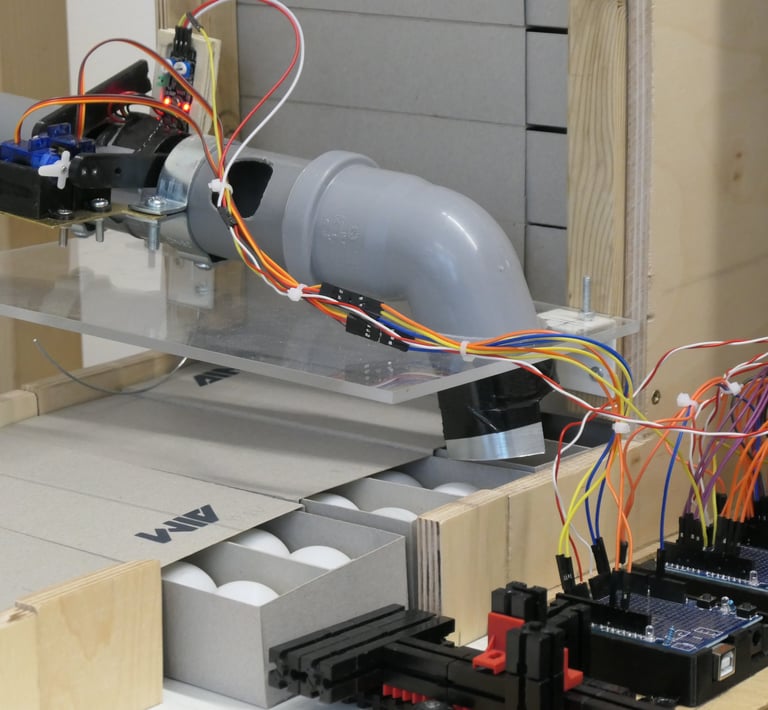 The balls are fed into the machine from above and initially separated for analysis in the four AI boxes. Below this is the waste container.