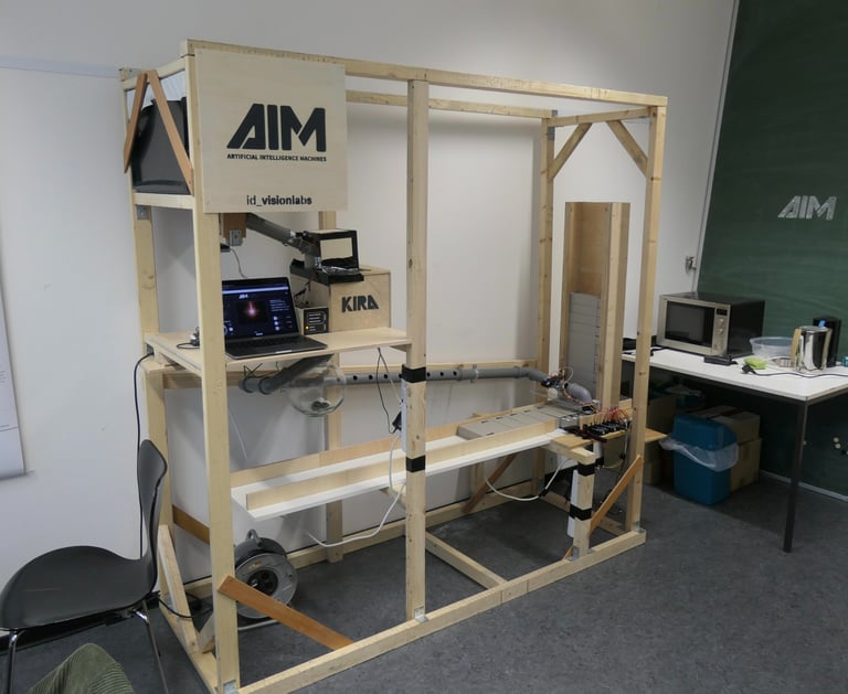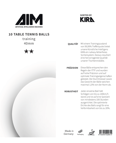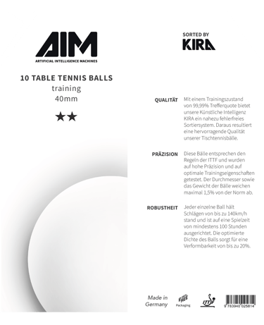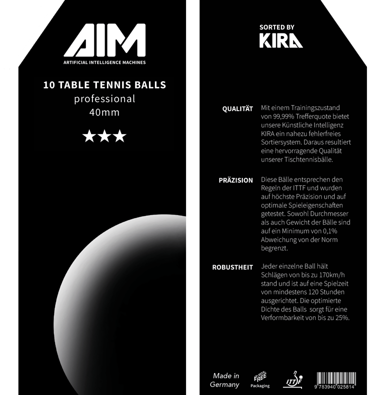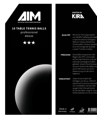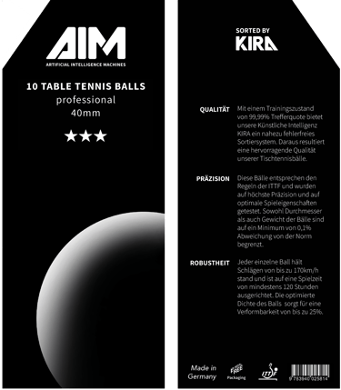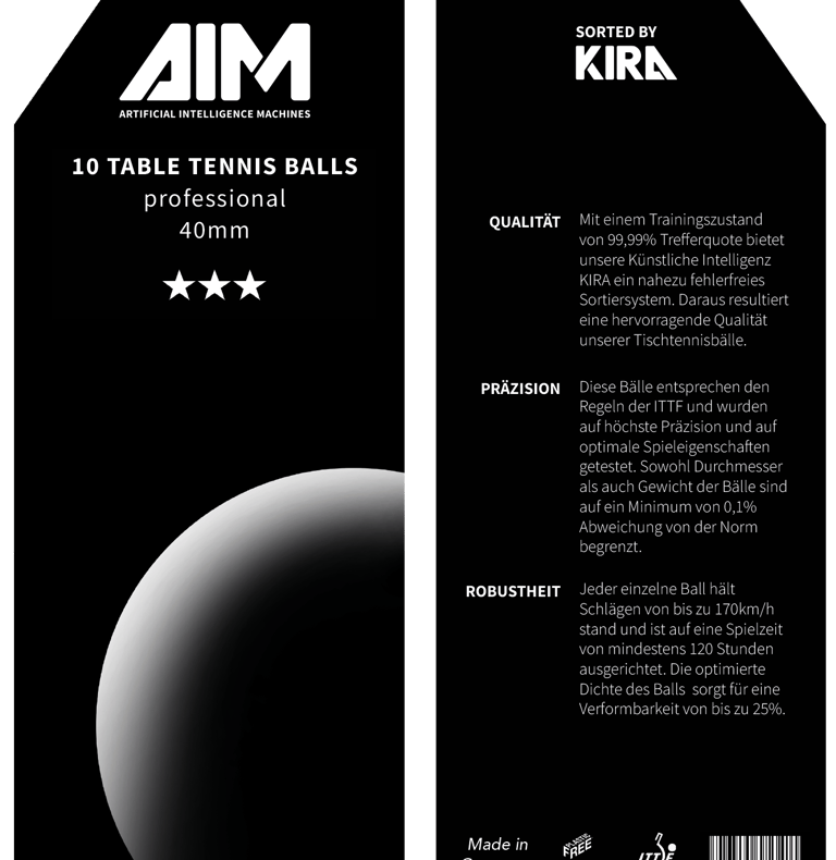 Quality test of 200 table tennis balls, 20 of which had either a color patch or a dent. The good balls were packed into trays of 10 at the end. Balls with color defects posed a particular difficulty. In order to eject these from the process with high precision, we integrated an artificial intelligence - KIRA - into our system.